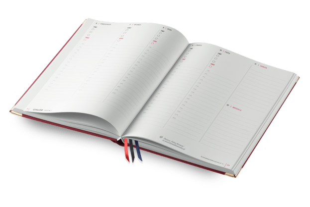 Wygodny podział w układzie tygodniowym, z miejscem na zapisanie ważnych spotkań lub wydarzeń o konkretnych godzinach.